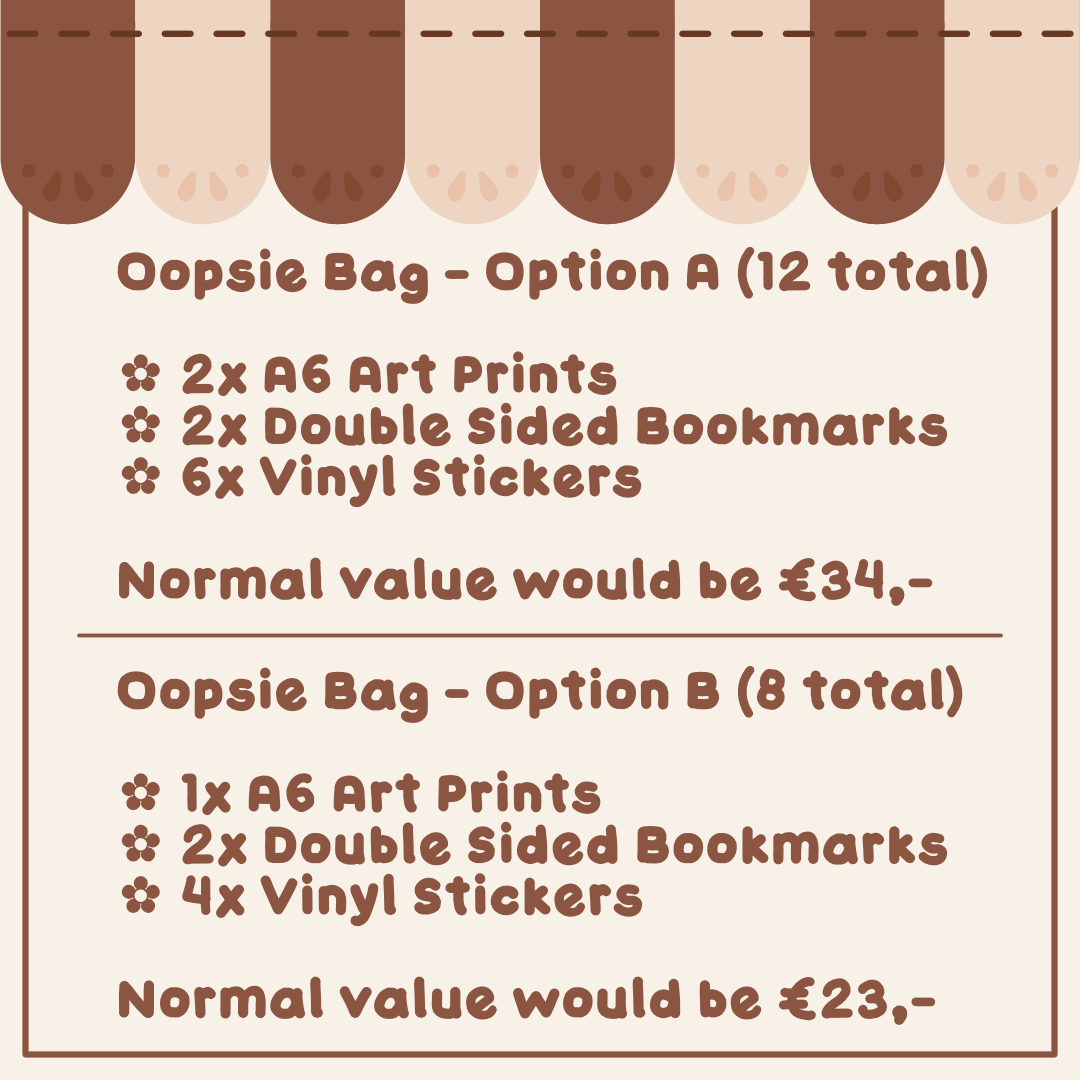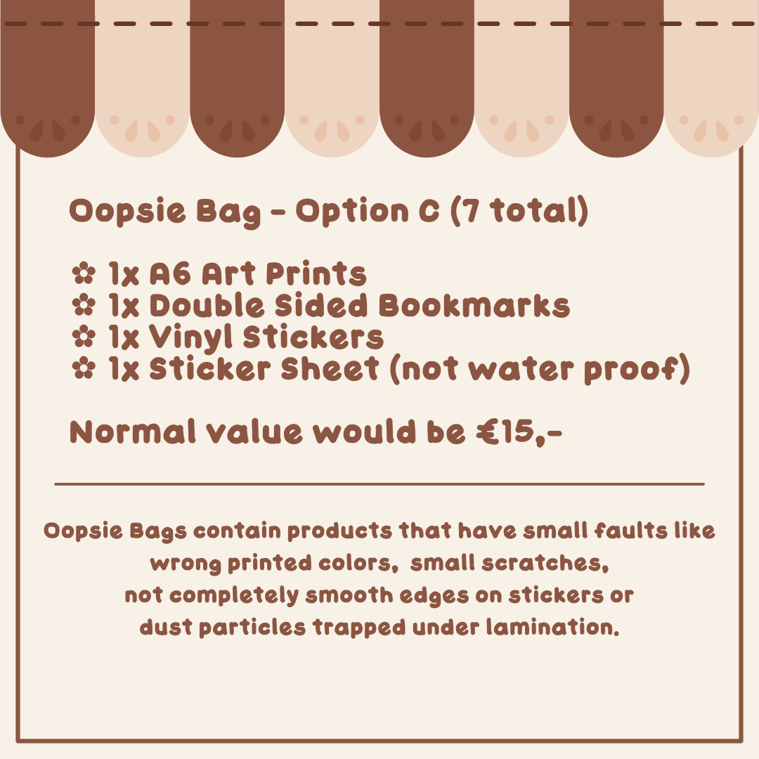 A small variety of oopsie bags! They contain products that have small faults like wrong printed colors, small scratches, not completely smooth edges on stickers or dust particles trapped under lamination.